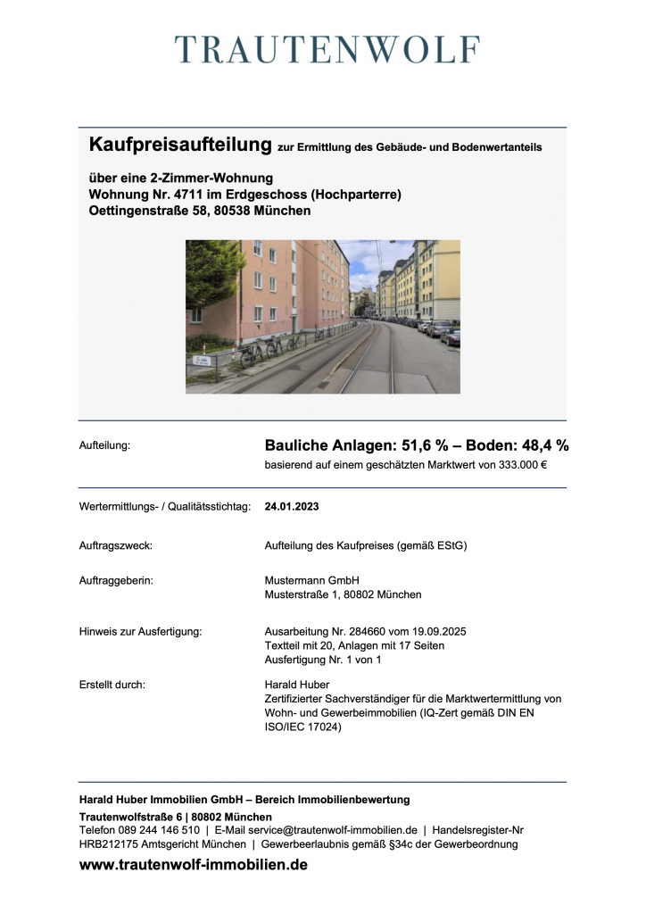 Es geht um die Aufteilung von Gebäude- und Bodenwert einer vermieteten Immobilie, mit dem Ziel, den Abschreibungsbetrag auf das Gebäude festzulegen.